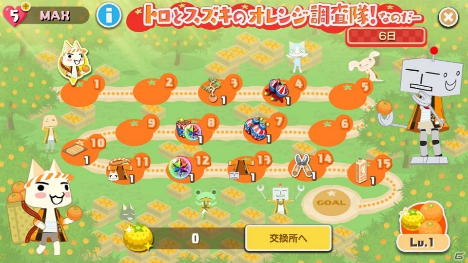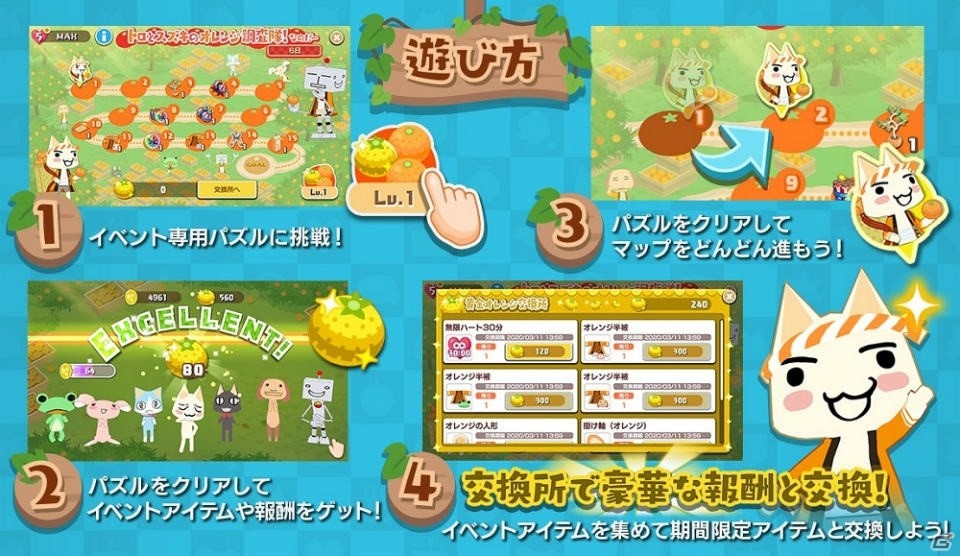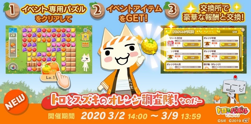 期間限定イベント「トロとスズキのオレンジ調査隊!なのだー」を本日3月2日(月)より開催いたします!今回のイベントからイベント専用パズルステージが新たに追加されます。 パズルをクリアして「黄金オレンジ」を集めると、 期間限定の衣装や家具などが入手できるほか、 パズルをクリアするだけでもランダムで衣装や家具、 アイテムなどが入手可能です。